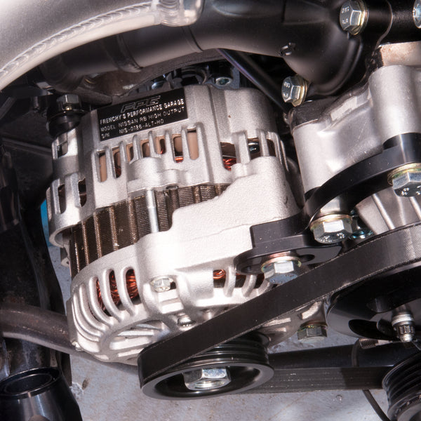 FPG's own design for an easy bolt on solution. Will fit RB20/25/26/30 with no modifications required. Custom CNC machined billet pulley finished with a black hard anodising will keep the unit spinning at the correct speed to avoid over revving the alternator. Mounting brackets are CNC machined for 100% accuracy and anodised black for a neat finish. The only kit on the market which provides structural integrity and holds the alternator true to the block with its back brace. This kit removes the factory steel tensioner setup and provides a cleaner alternative. Belt size will vary depending on the engine model, balancer used and water pump pulley used. A belt close to the one currently on your engine will fit however in some cases it is better to measure the length required. Will handle loads up to 150A and the units have been bench tested to 180A with no issues. Each unit is fitted with a serial number plate for easy identification and warranty purpose in case of any manufacturing faults. Alternators are Genuine Mitsubishi units as of October 2019 for added reliability.
